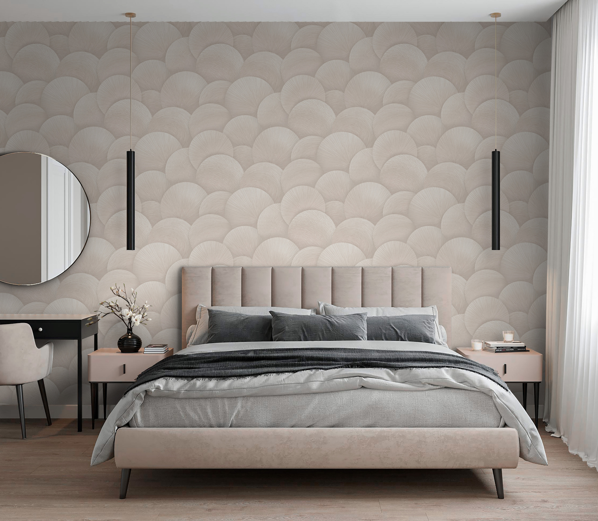 Наша новая коллекция "Sferum" - это непринуждённый абстрактный рисунок в виде сфер, украшенных тонкими перламутровыми нитями. Универсальный орнамент подойдёт для любых помещений: от прихожей до детской комнаты.