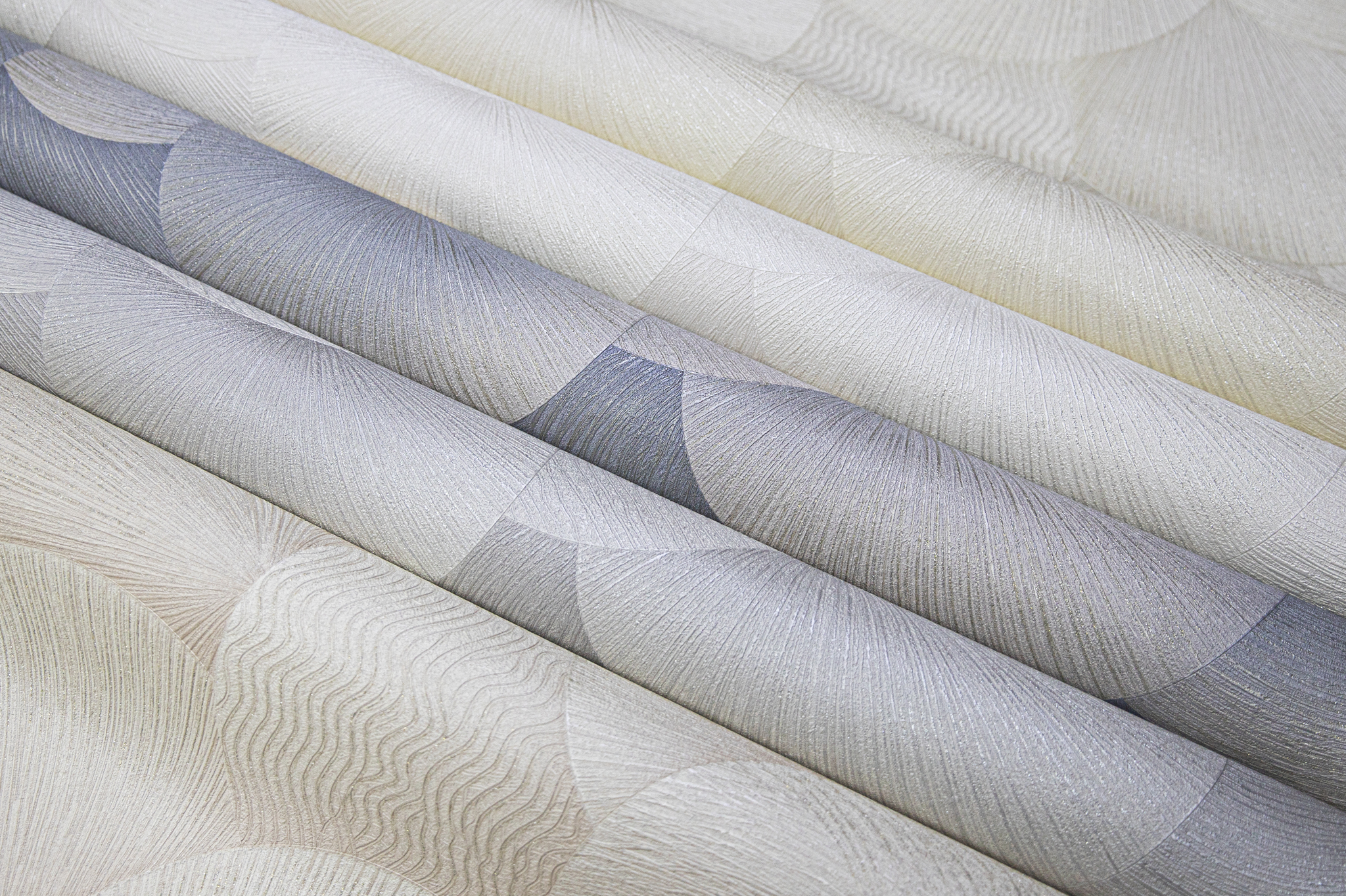 Коллекция представлена 5 мотивами и 5 фонами. Основная палитра полотен выполнена в монохромных оттенках: молочных, кремовых и серых. Но в коллекции есть и один "маячковый" дизайн, притягивающий к себе внимание: сине-стальное полотно украшают воздушные круги цвета серого шёлка.